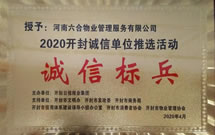 2020年5月13日下午,河南六合物業(yè)管理服務(wù)有限公司獲評“2020開封誠信單位推選活動誠信標(biāo)兵”榮譽(yù)。“2020開封誠信標(biāo)兵”評選活動,旨在增強(qiáng)企業(yè)誠信意識,
