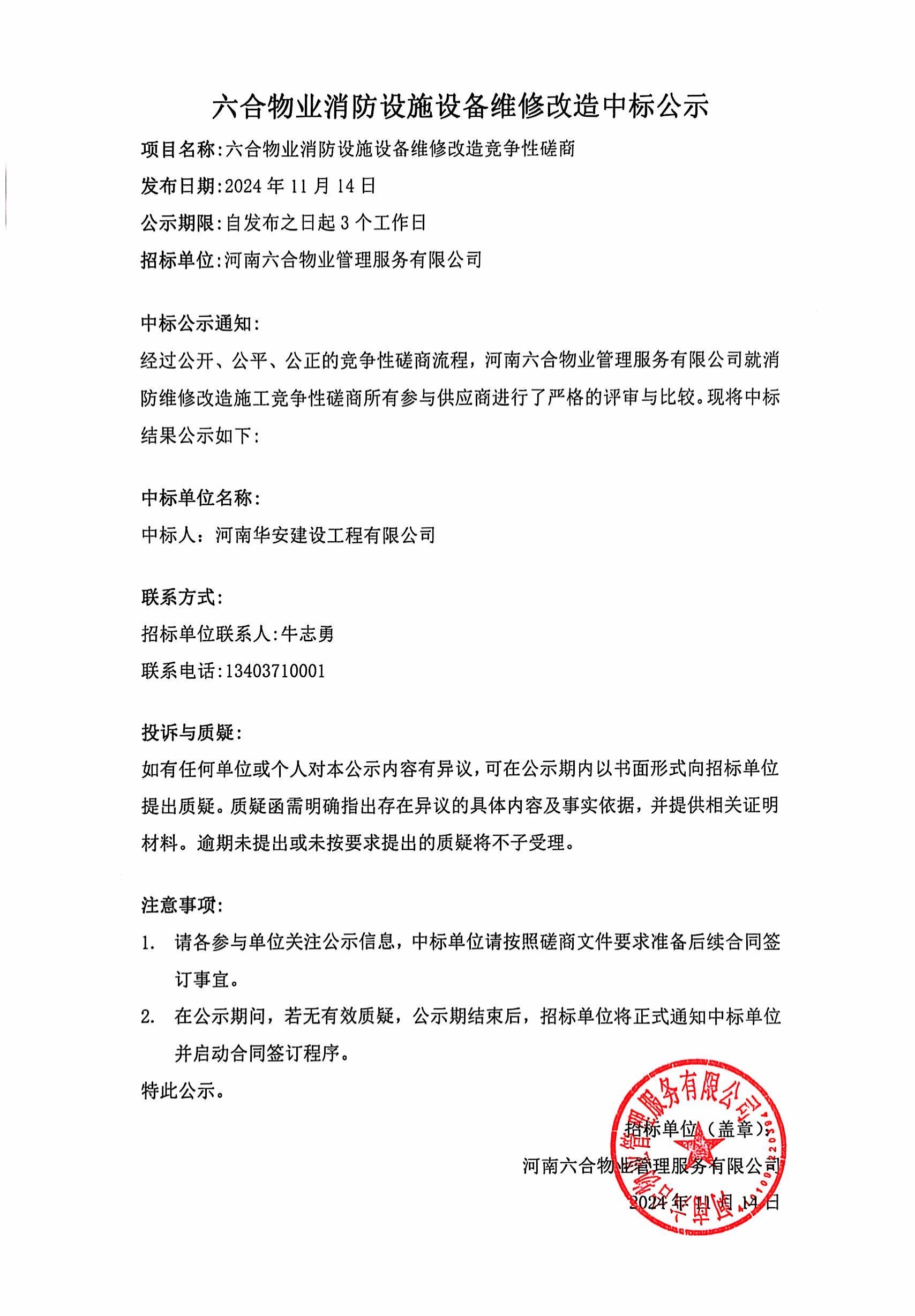 六合物業(yè)消防設(shè)施設(shè)備維修改造中標公示 發(fā)布時間:11-14瀏覽次數(shù):0 查看詳情>>