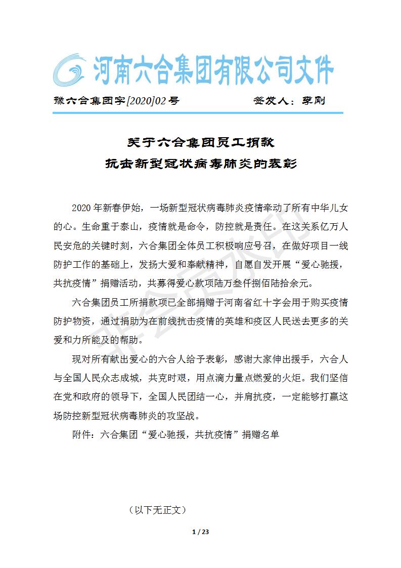 六合集團(tuán)對所有獻(xiàn)出愛心的六合人給予表彰,感謝大家伸出援手,六合集團(tuán)與全國人民眾志成城,共克時艱,用點(diǎn)滴微光的力量來點(diǎn)燃愛的火炬,我們一定能夠打贏這場防控新型冠狀病毒肺炎的攻堅戰(zhàn)。