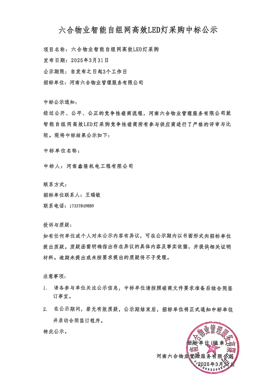 六合物業(yè)智能自組網(wǎng)高效LED燈采購(gòu)中標(biāo)公示 發(fā)布時(shí)間:03-31瀏覽次數(shù):1 查看詳情>>